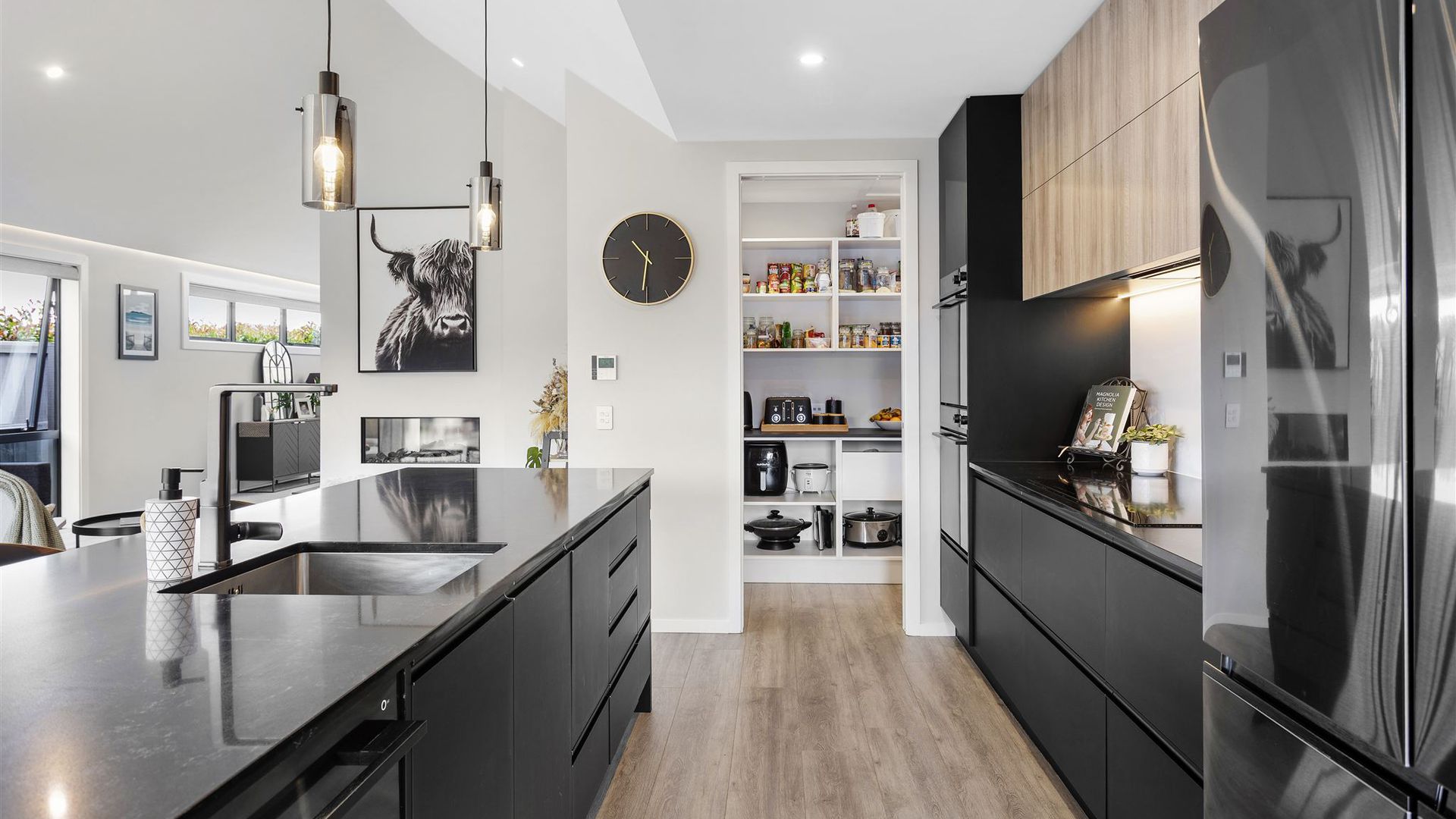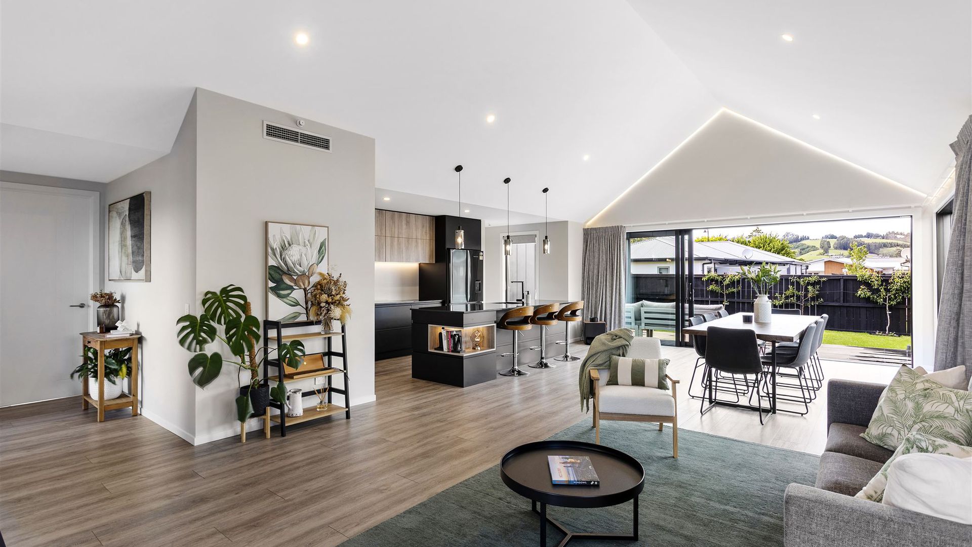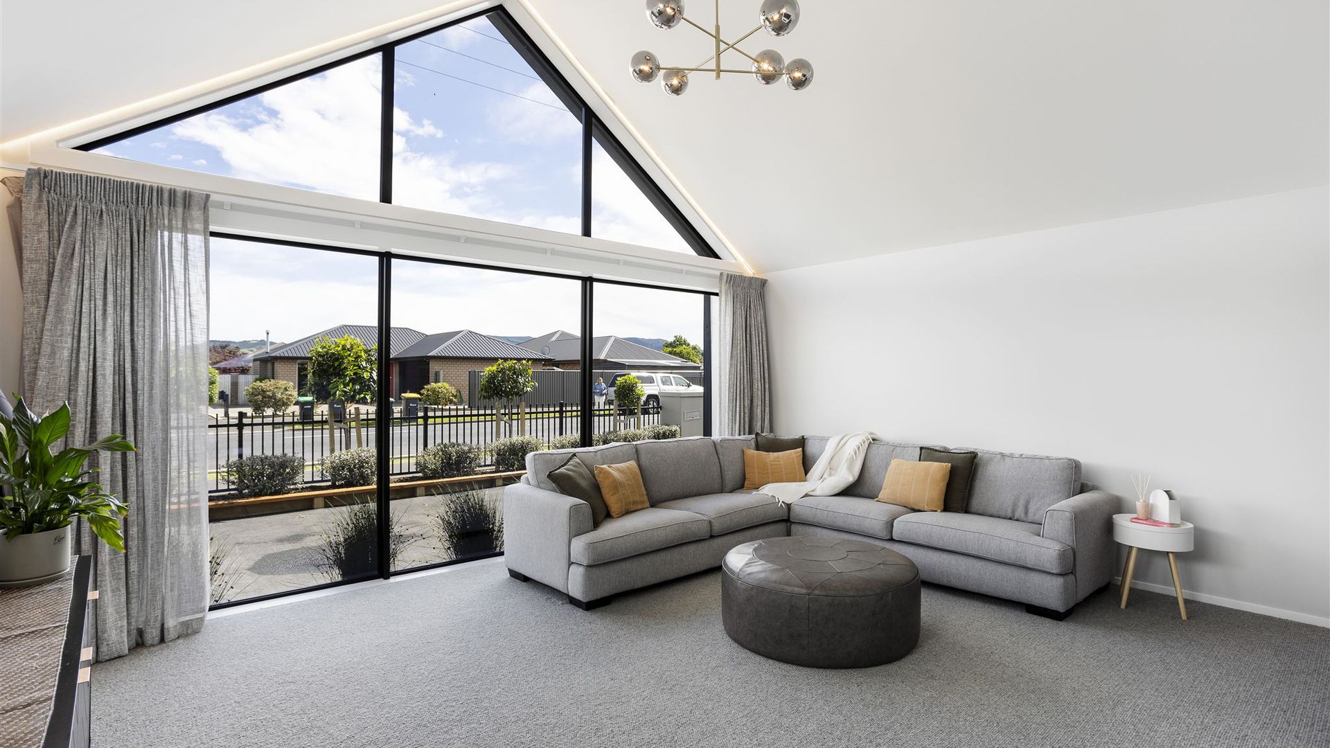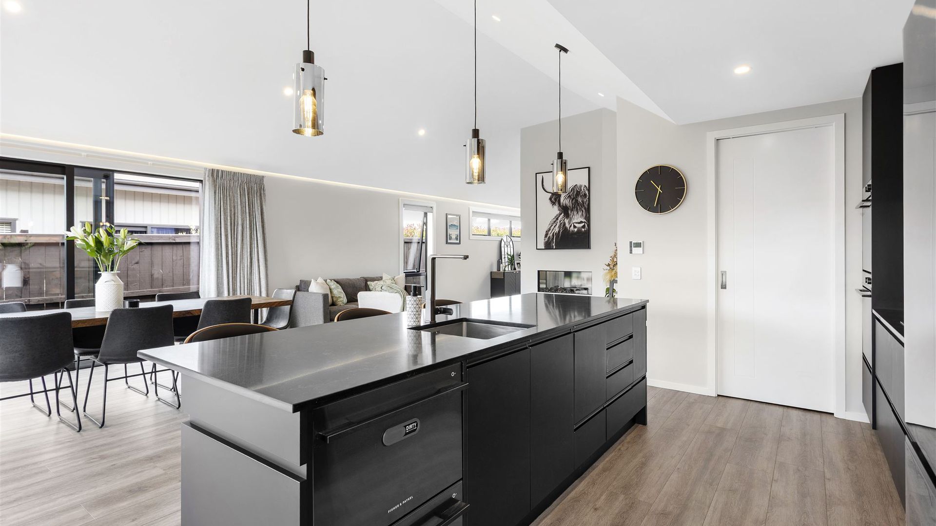 This architecturally striking home in sought-after Mosgiel is a rare opportunity for buyers wanting style, comfort, and clever design in one beautifully executed package. Step inside and be welcomed by soaring ceilings and a spacious open-plan living, dining, and kitchen area. The sleek, contemporary kitchen features a large island, high-end finishes, and a walk-in pantry—ideal for entertainers and busy households alike. Two sets of stacking doors open seamlessly to the sun-soaked deck and BBQ area, perfect for summer gatherings and easy indoor–outdoor living.