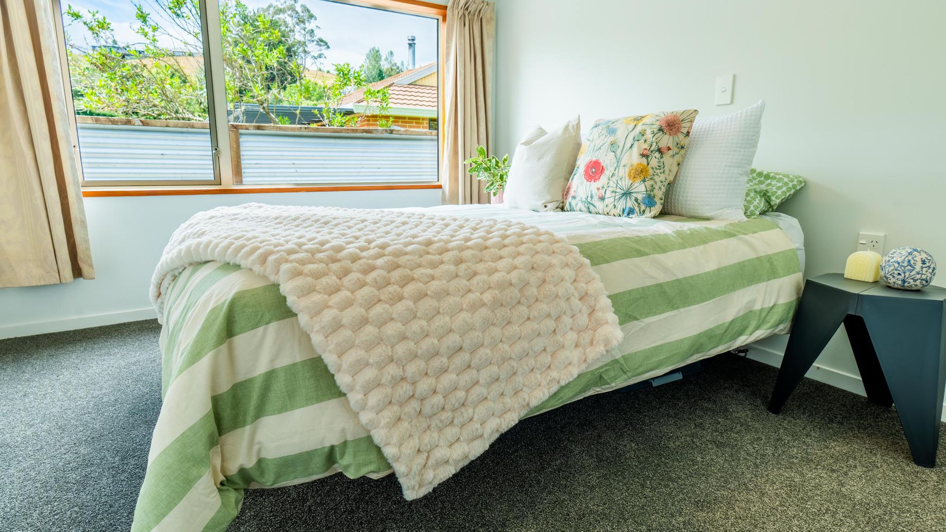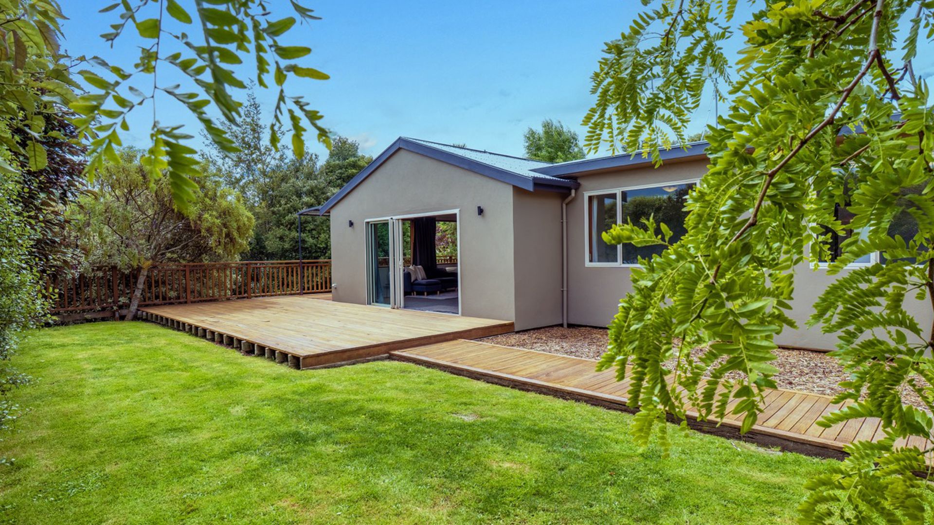 Surrounded by established trees, the home feels like a sanctuary. A wraparound deck with pergola creates the perfect space to relax or entertain, while seamless indoor–outdoor flow is achieved through two sets of sliding doors—one from the kitchen and one from the lounge.