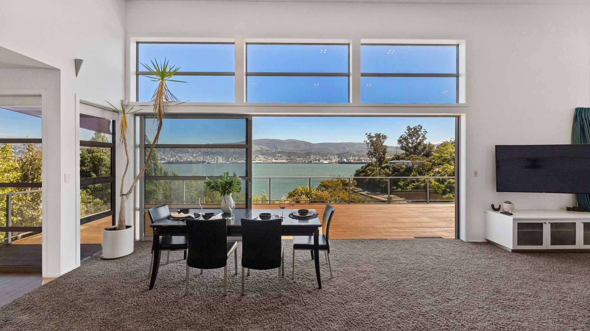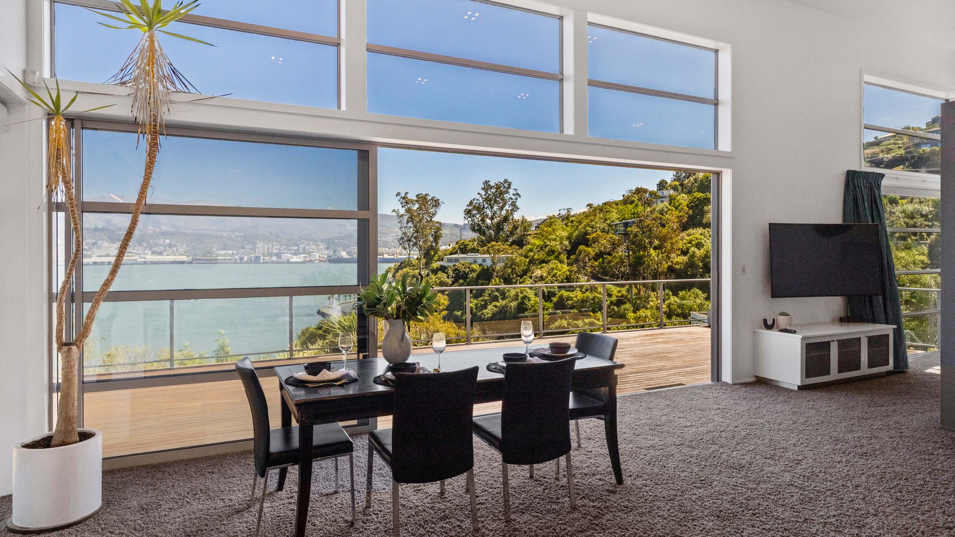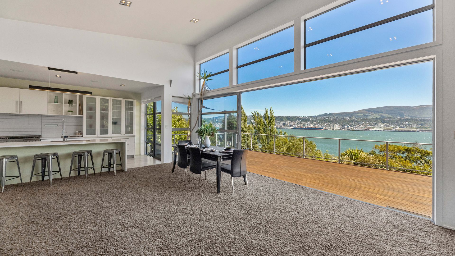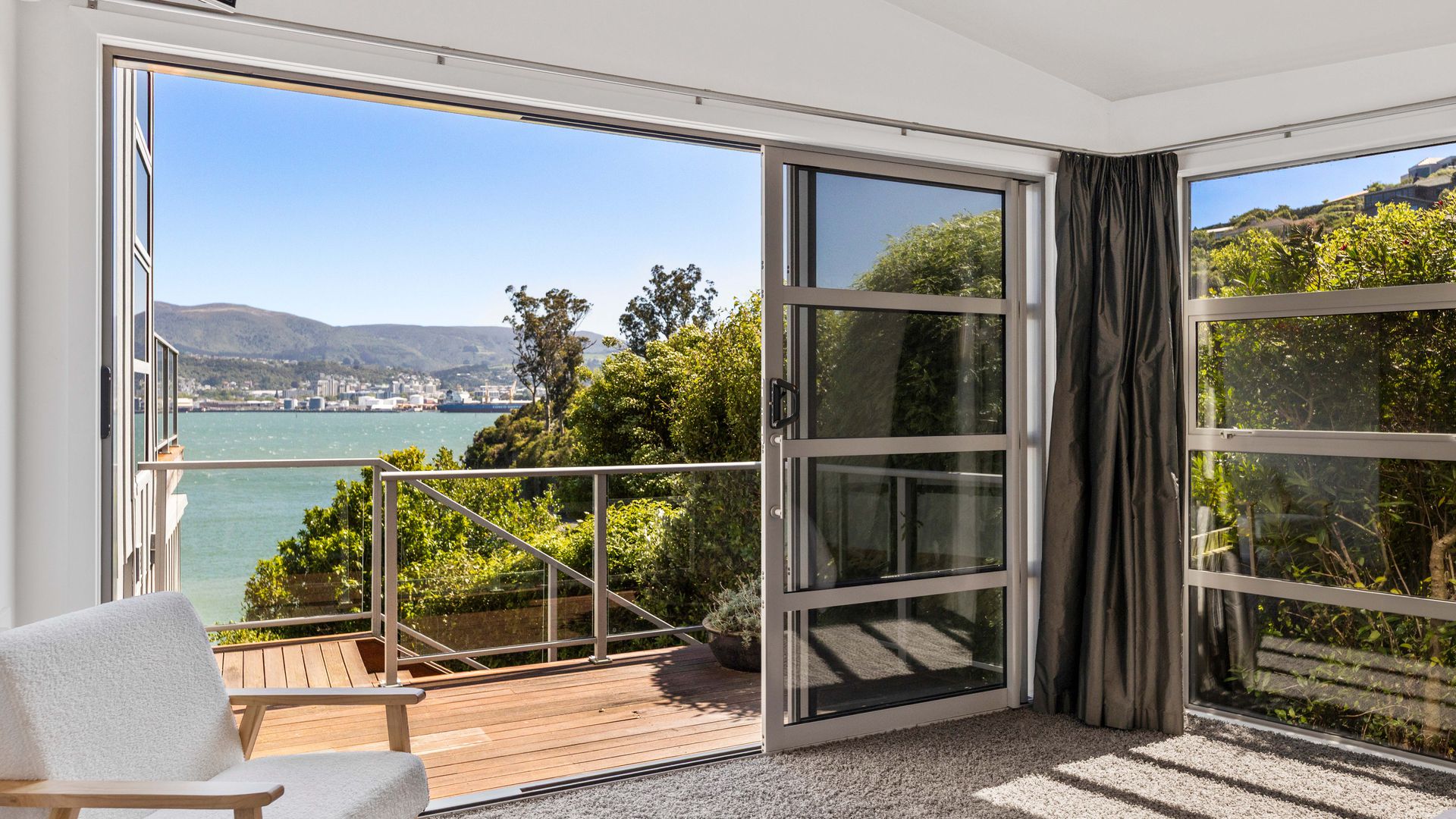 This multi-level architectural home combines modern luxury with a tranquil, retreat-like atmosphere, offering both privacy and grandeur in equal measure. Thoughtfully positioned to harness all-day sun and benefit from the natural shelter created by the contour of the bay, the home feels warm, calm, and deeply connected to its surroundings. Inside, expansive open-plan living forms the heart of the home. The elevated ceilings create a sense of spaciousness, while large sliding doors and full-height windows frame ever-changing harbour vistas. The kitchen is both beautiful and functional, and a second living area offers a relaxed space for quiet evenings, enhanced by the warmth of a gas fire. With sunlight pouring in throughout the day and the bay’s natural landform providing shelter, every space feels inviting year-round.