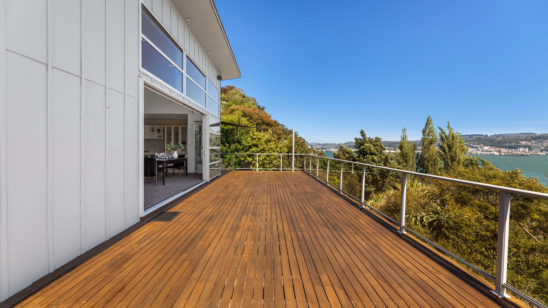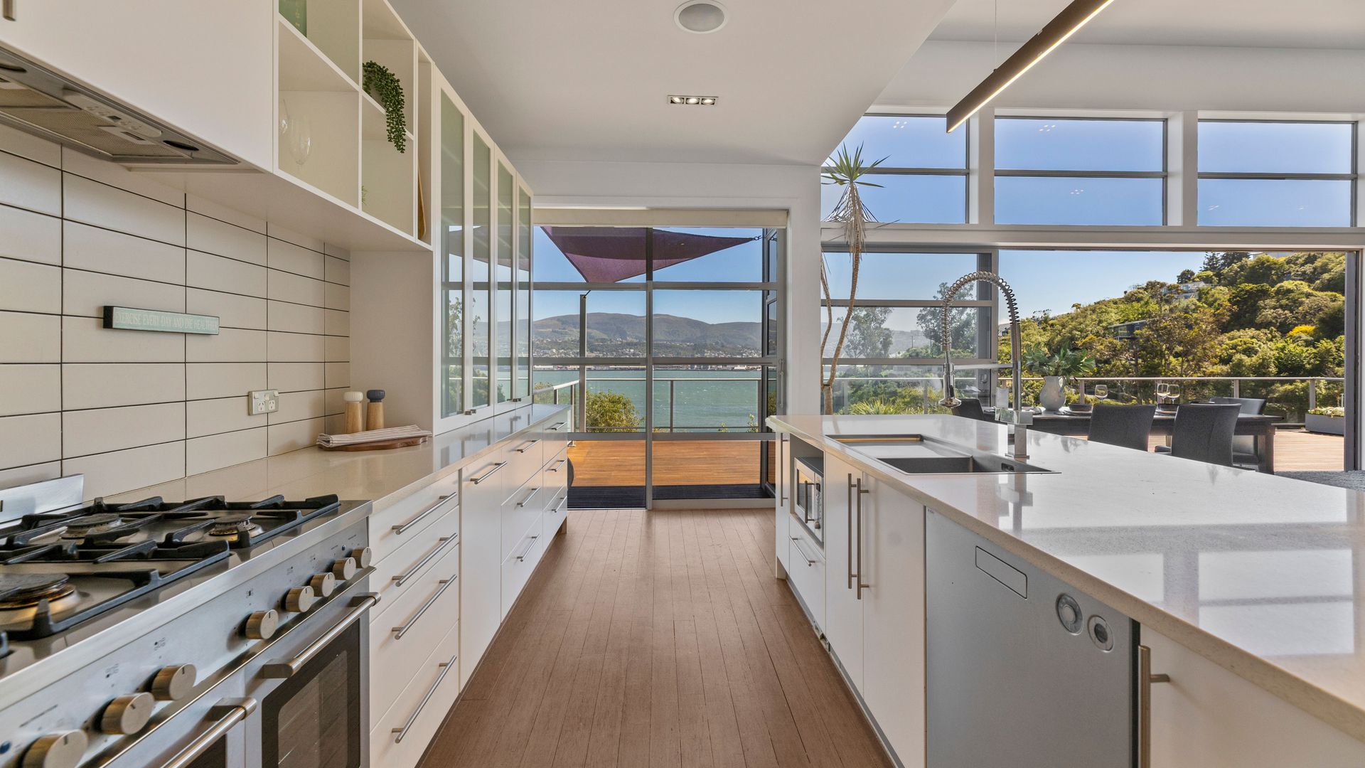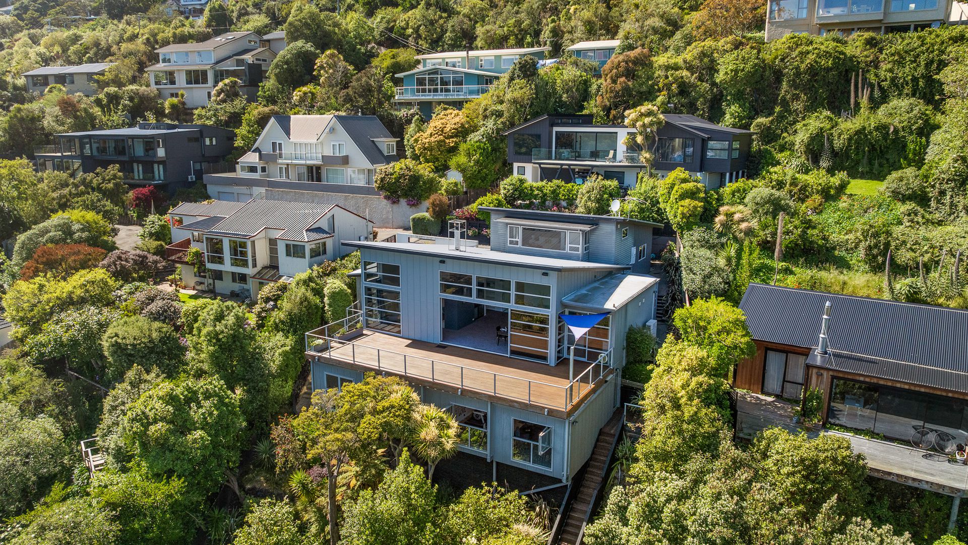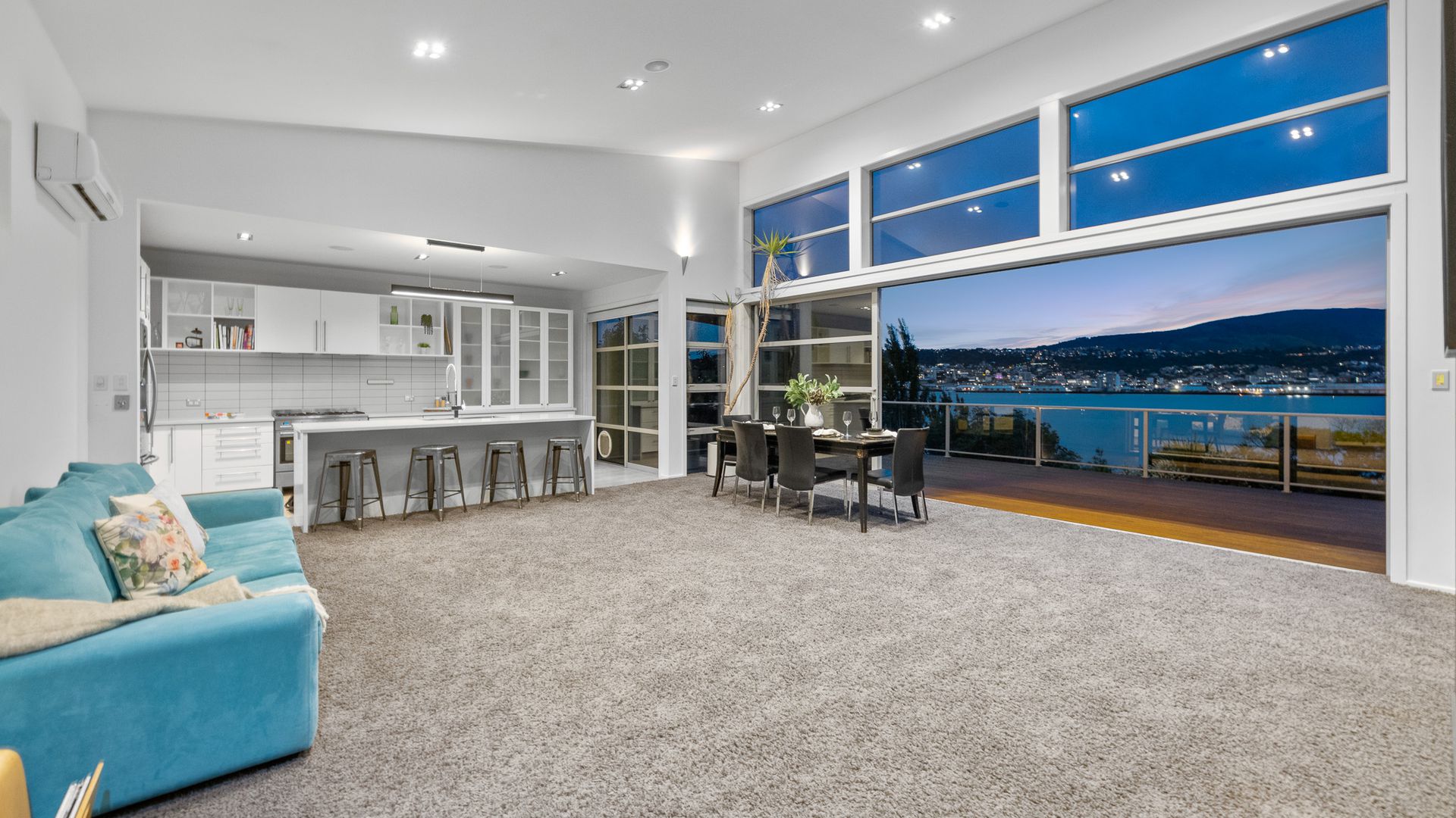 This multi-level architectural home combines modern luxury with a tranquil, retreat-like atmosphere, offering both privacy and grandeur in equal measure. Thoughtfully positioned to harness all-day sun and benefit from the natural shelter created by the contour of the bay, the home feels warm, calm, and deeply connected to its surroundings. Inside, expansive open-plan living forms the heart of the home. The elevated ceilings create a sense of spaciousness, while large sliding doors and full-height windows frame ever-changing harbour vistas. The kitchen is both beautiful and functional, and a second living area offers a relaxed space for quiet evenings, enhanced by the warmth of a gas fire. With sunlight pouring in throughout the day and the bay’s natural landform providing shelter, every space feels inviting year-round.